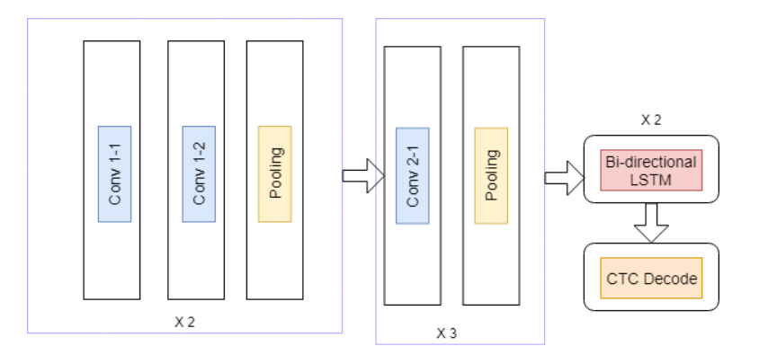 CNN layers extract relevant features from the input image fed during training. The model architecture contains five convolution blocks. The first two blocks consist of two convolution layers with a filter kernel of size 5X5 and RELU activation followed by a pooling layer. The next three blocks consist of one convolution layer each with a filter kernel of size 3X3 and RELU activation followed by a pooling layer. While the image height is downsized by 2 in each block, feature maps (channels) are added, so that the output feature map (or sequence) has a size of 200×256.