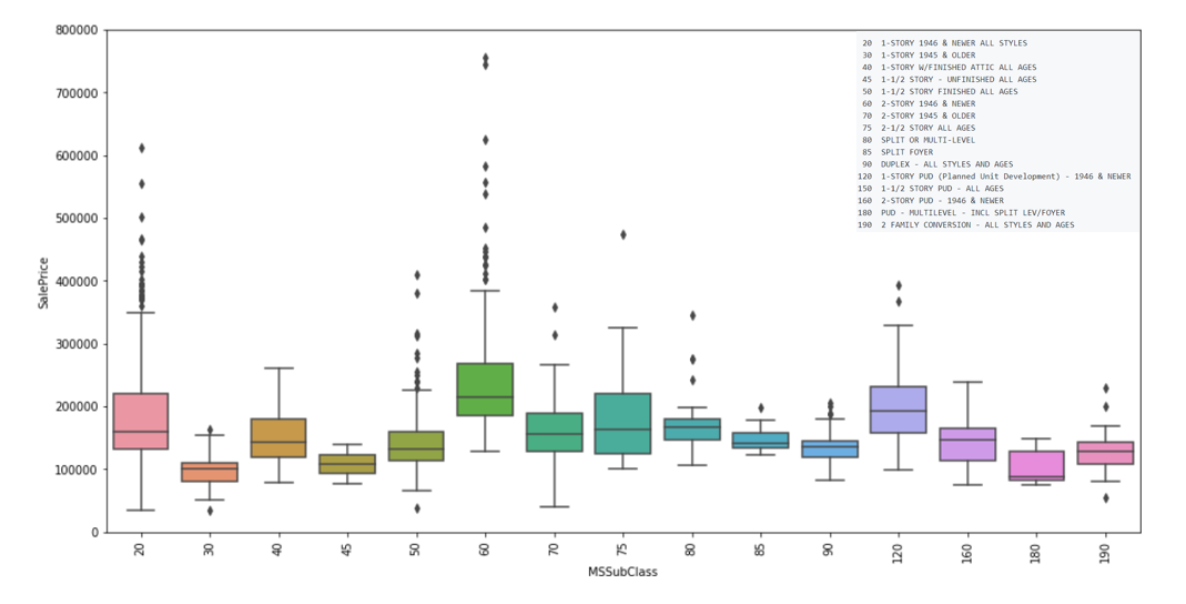 Further, I was interested in understanding whether the time of build of a house impated its sale price. The below boxplots illustrate the relationships between the variables YearBuilt and MSSubClass. Looking at the plots, we can see that the year of build did not necessarily have any impact on the price of the house. Hwowever, the variable MSSubClass revealed a different story. It can be seen that houses built after 1946 had on average higher prices that older built houses.